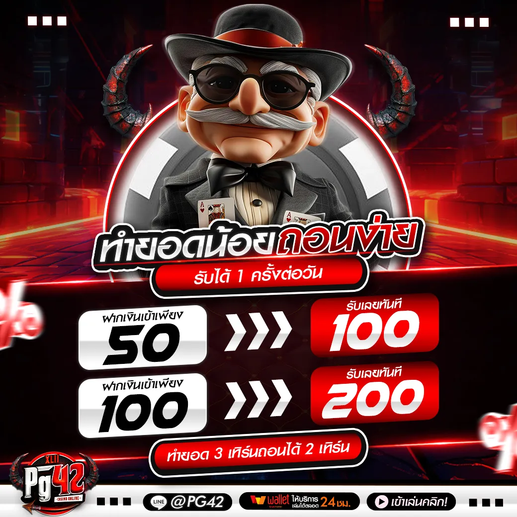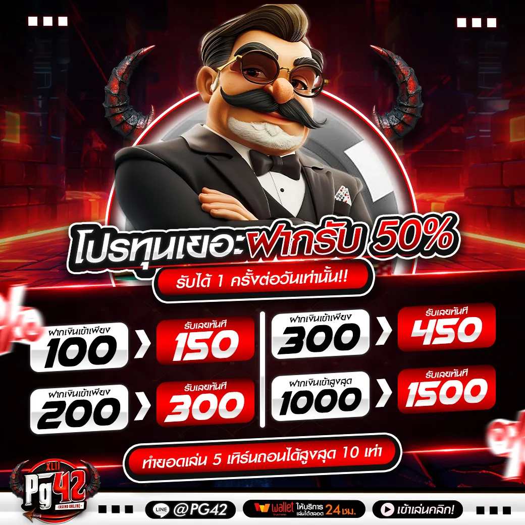 pg42 โปรโมชั่นฝาก 50 รับ 100 ถอนไม่อั้น ในเกมสล็อตออนไลน์ เป็นหนึ่งในโปรโมชั่นที่ได้รับความนิยมในหมู่ผู้เล่นเกมสล็อต โดยเฉพาะในบรรดาผู้ที่ชื่นชอบการเล่นด้วยเงินจริง ผู้เล่นจำเป็นต้องฝากเงินจำนวน 50 หลังจากทำการฝากเงิน ผู้เล่นจะได้รับโบนัสเพิ่มเติมให้เป็น 100 โปรโมชั่นฝาก 50 รับ 100 ถอนไม่อั้น เป็นตัวเลือกที่น่าสนใจสำหรับผู้เล่นที่ต้องการเพิ่มเงินทุนในการเล่นเกมสล็อต แต่สำคัญที่ผู้เล่นควรทำความเข้าใจกับเงื่อนไขด้วย